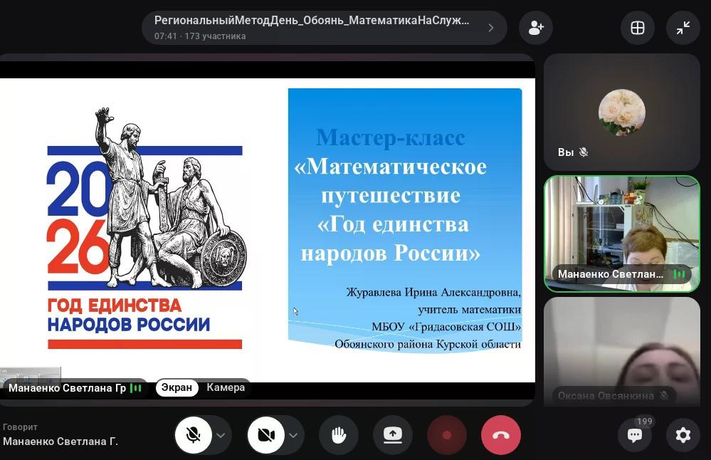 Манаенко С.Г., руководитель РМО учителей Обоянского района, подробно осветила принципы концепции технологического просвещения как способа укрепления технологического суверенитета страны. Пестрецова Т.Г., учитель Чекмаревской школы, рассказала о развитии инженерного мышления на уроках математики. В интересной форме провела математическое путешествие в Якутию Журавлева И.А., учитель математики Гридасовской школы, представив подборку задач с решением по тематике Года единства народов России.
